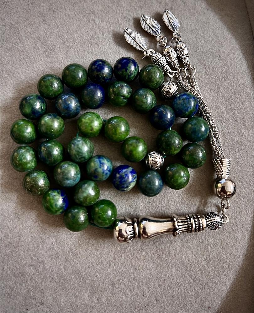 مسبحة أنيقة مصنوعة يدويًا من حجر الأزوريت الطبيعي، بتدرجاته الغنية من الأخضر والأزرق التي تجمع بين طاقة الأرض وهدوء السماء.